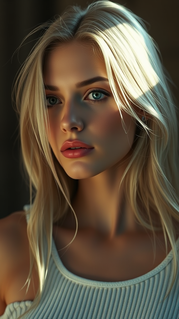 Melainotype portrait of a blonde woman, featuring cinematic lighting and crafted in Unreal Engine 5, with an editorial photography aesthetic. Captured with a 70mm lens, the image emphasizes depth of field and employs tilt blur, using a shutter speed of 1/1000 at f/22. White balance is set to 32k, with super-resolution in ProPhoto RGB, embodying a VR experience. Influences of Artgerm and Alex Ross bring a tall, epic presence to the work, utilizing halfrear and backlighting. The scene incorporates natural, incandescent mood lighting, enhanced by optical fiber accents, producing a soft volumetric and moody atmosphere. Contre-jour and dark lighting interplay with accent lighting, utilizing global illumination and screen space global illumination alongside ray tracing. Red rim light is blended with a cool color grading set to 45%, enhanced by optical effects such as scattering and glowing shadows. The textures are rough yet shimmering, with ray tracing reflections, lumen effects, and screen space reflections, alongside diffraction grading and chromatic aberration. GB displacement and scan lines contribute to the detailed composition. Ray traced ambient occlusion, anti-aliasing, FKAA, TXAA, RTX, SSAO techniques are all applied, accompanied by advanced shaders, post processing and production work. Cel shading, tone mapping, CGI, VFX, and SFX render an insanely detailed, intricate, hypermaximalist, and elegant image. The hyper-realistic and super-detailed dynamic pose is centered, creating a compelling photographic masterpiece.