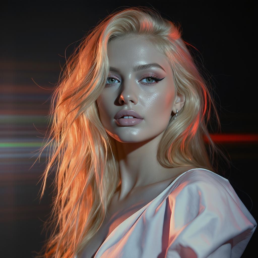 Melainotype portrayal of a blonde woman, enveloped in cinematic lighting akin to Unreal Engine 5, her presence exuding the grace of editorial photography. Captured through a 70mm lens, the image plays with depth of field and tilt blur, set at shutter speed 1/1000 and an aperture of F/22, balanced at 32k for brilliant white hues. The scene harnesses super-resolution, rendered in megapixel precision, embracing the vivid spectrum of ProPhoto RGB. A VR-like immersion unfolds, the tall and epic composition reminiscent of Artgerm and Alex Ross artworks, with halfrear and backlight orchestrating a dance of natural and incandescent hues. Optical fiber hints at moody undertones amidst cinematic and studio lighting, all softened by volumetric ambiance. Contre-jour contrasts highlight her form, the atmosphere punctuated by dark, accent, and global illumination, enriched with screen space and ray tracing global illumination. A red rim light adds a striking dimension, cooled by 45% in its color grading. Optics and scattering weave glowing shadows, rough shimmer graces the edges, and ray tracing reflections gloss the contours, with lumen and screen space reflections deepening the texture. Diffraction grading introduces chromatic aberration, GB displacement and scan lines pepper the frame. Ray tracing ambient occlusion enhances depth, flowing anti-aliasing techniques like FKAA, TXAA, and RTX smooth the visual narrative. Shader magic through OpenGL, GLSL, and post-processing envelops, enhanced by cel shading and tone mapping. A synergy of CGI, VFX, and SFX crafts an insanely detailed and intricate visage, promoting hypermaximalist elegance. Hyper realism meets super detailing in a dynamic pose, beautifully centered, culminating in photography that blurs the line between fantasy and reality.