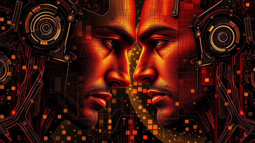 Men and machine harmoniously intertwined in a beta world, showcasing intricate connections. Embrace the essence of illusory wallpaper portraits, with a flair for colorful realism. Dive into modular structures with intense close-ups, highlighted by a palette of dark gold and rich red. Experience ultra-high-definition imagery, with a strong mosaic-inspired realism influence, capturing the delicate balance between man and machine.