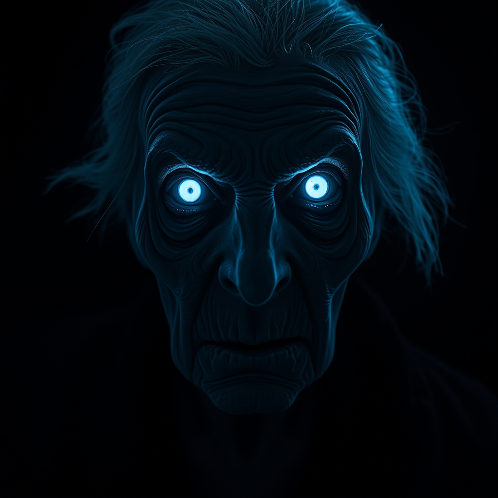 Menacing and eerie spectral figure of an old woman, set against a pitch-black backdrop, her eyes empty with stark white pupils, face illuminated with an otherworldly blue-grey glow. The atmosphere is steeped in horror, exuding a dark and haunting presence. The image is hyperrealistic, with meticulous attention to detail that captures every wrinkle and shadow. The high-definition quality provides an 8k resolution, immersing the viewer in its chilling grip, maintaining a 9:16 aspect ratio with enhanced depth and surreal visual intensity.