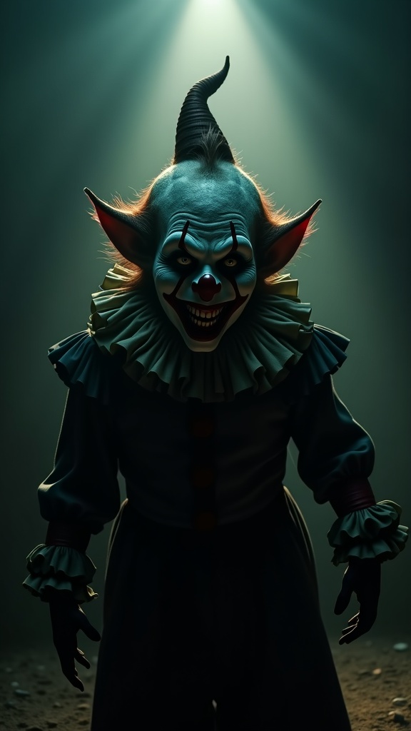 View this AI-generated image featuring a terrifyingly menacing dwarf clown with a chilling grin performing in a shadowy macabre circus spectacle the scene is steeped in horror rich with dark intricate designs and elaborate details dramatic moody lighting casts eerie shadows enhancing the photorealis