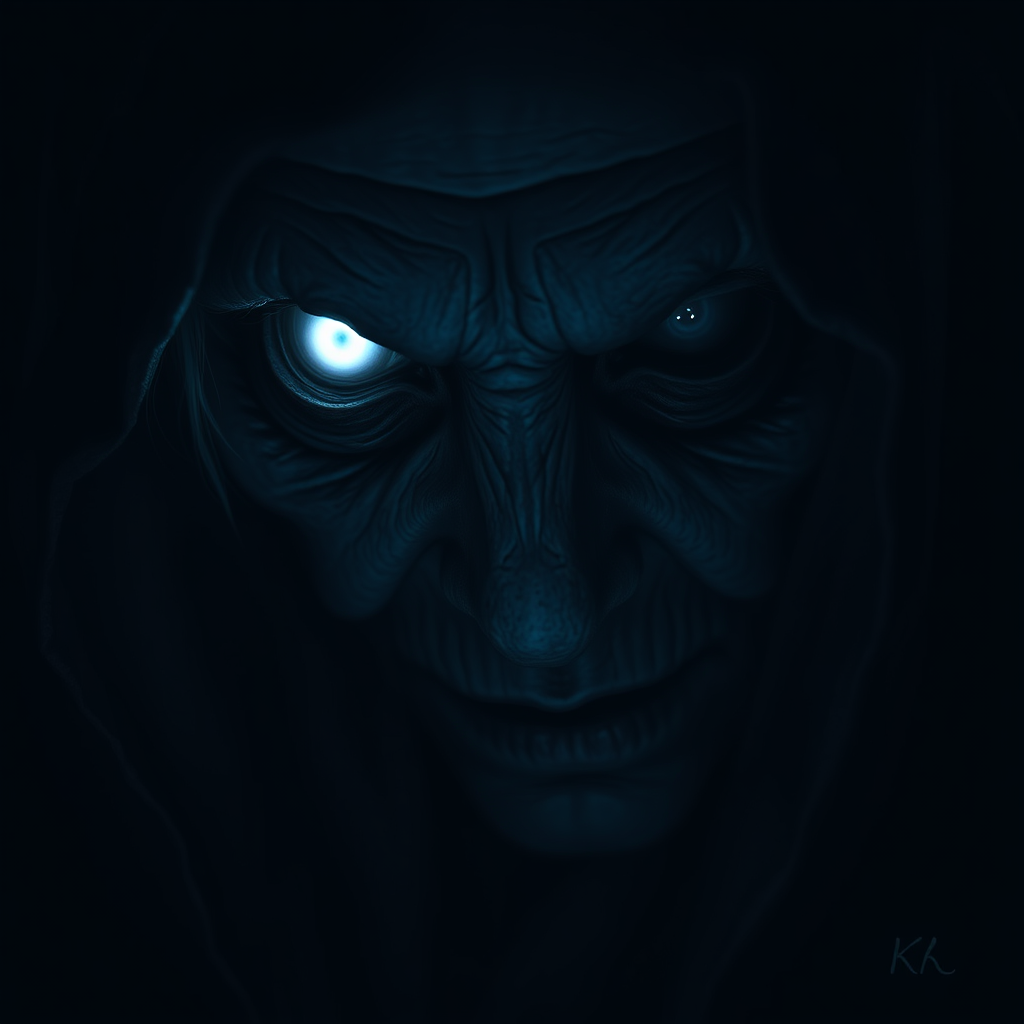Menacing eerie spectral old woman, enveloped in darkness, ghostly white pupil eyes glowing, subtle cold blue-grey illumination highlighting her face, intense close-up shot, spine-chilling atmosphere, dark and haunted, hyperrealistic, highly detailed, 8k resolution, portrait aspect ratio.
