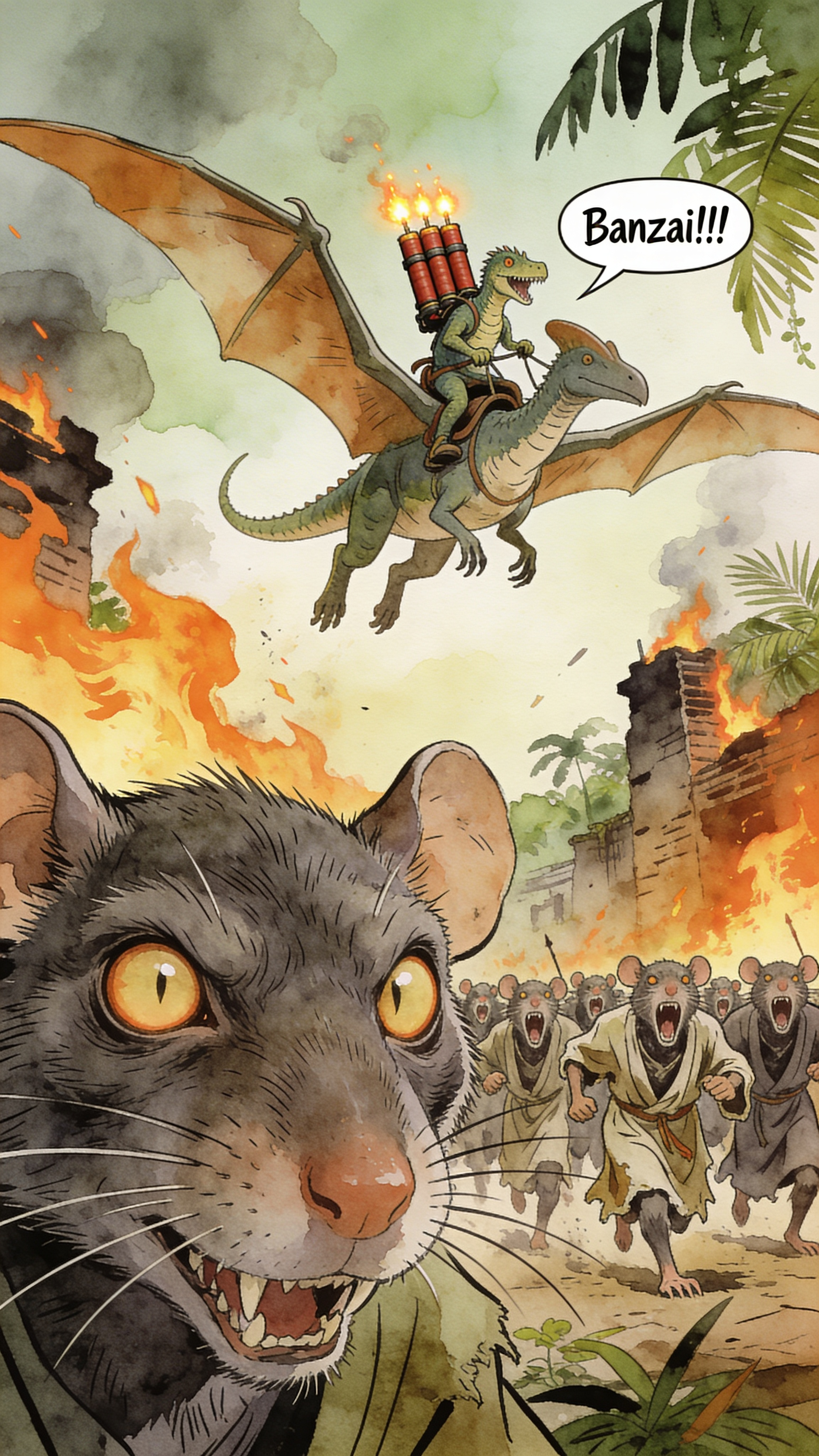 Comic book panel, a giant rat's head in the foreground, wide-eyed and menacing, looking directly at the viewer. Behind it, a horde of rat-like creatures in tattered robes charging forward, screaming. In the sky, a small dinosaur riding a large pterodactyl, carrying lit dynamite sticks, with a speech bubble saying "Banzai!!!". The background features burning ruins and jungle foliage under a smoky, pale sky. Cartoonish, gritty, detailed line art with watercolor washes. Desaturated, earthy tones of greens, browns, and grays, with bright orange flames. Intense, chaotic, and action-packed mood.
