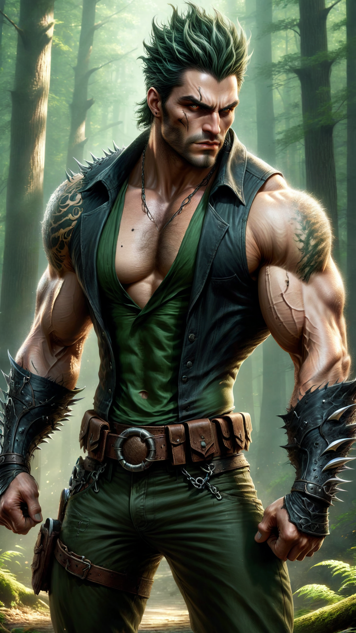 Mercenary supervillain. Mutilate is short and stocky, thick muscled, muscular, hirsute and hairy bodied. He has retractable metal claws in his fists hat he can tear things to shreds. He's violent and hot tempered. He gets into a lot of fights, so a quick healing factor helps everything. Caucasian male, pale green eyes and dark brown hair. His hair is short and spiky, cut close on the sides and back and cut flat across the top. He usually has a 5o'clock shadow on his face and and a surly scowl. He prefers tight, form-fitting T-shirts in forest green--- they're usually dirty and shredded to pieces, barely covering his hairy chest. He has a labret piercing under his bottom lip .He has retractable claws in his fists. that he can tear things to shreds. Of the trio, he's the most violent and hot tempered. He prefers tight, form-fitting T-shirts in forest green--- they're usually dirty and shredded to pieces, barely covering his hairy chest. Black leather bracers on his wrists. He has a labret piercing under his bottom lip and several piercings in one ear-- it's rumored that Spindle did it. He also wears tight fitting forest green cargo pants and black leather combat boots. Full. Body pose. Probably ripping off his shirt, even if it's not necessary.