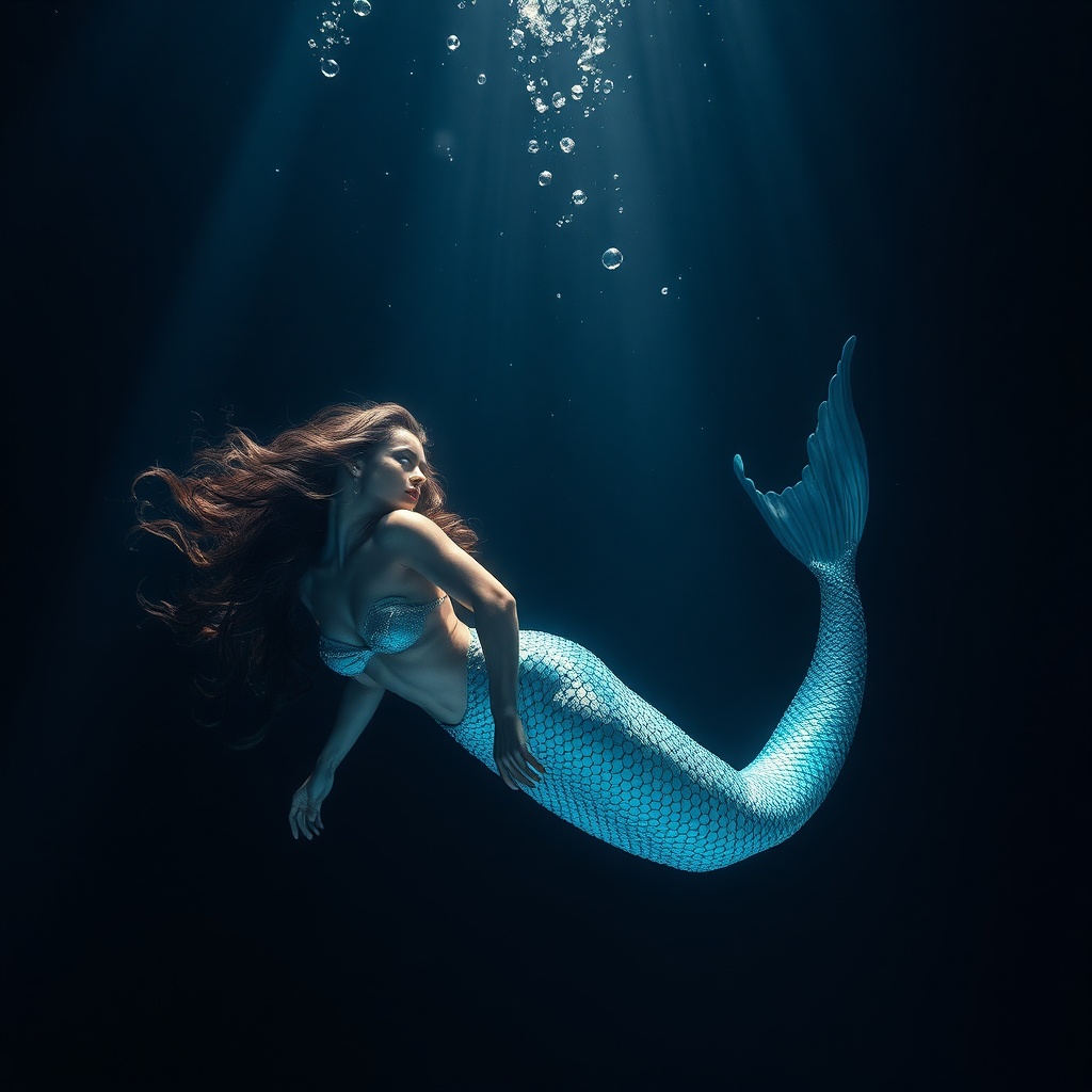 View this AI-generated image featuring a stunning mermaid gracefully swims in the deep ocean surrounded by swirling air bubbles her iridescent scales shimmering in hues of light blue the scene captures photorealistic details with a breathtaking 8k resolution as floodlight casts cinematic beams throu