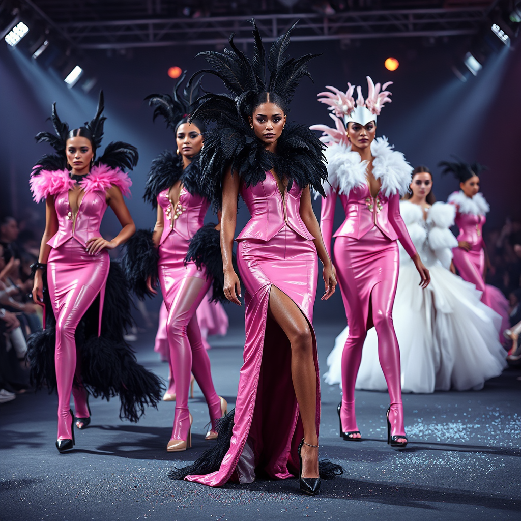 Mesmerizing ensembles, luxurious couture: models impeccably adorned in sleek pink glossy leather, adorned with crow feathers and extravagant boas, elevated by high heels, sprinkled with glitter, showcasing exquisite details and captivating runway intricacies, illuminated by spotlights in an 8:10 aspect.