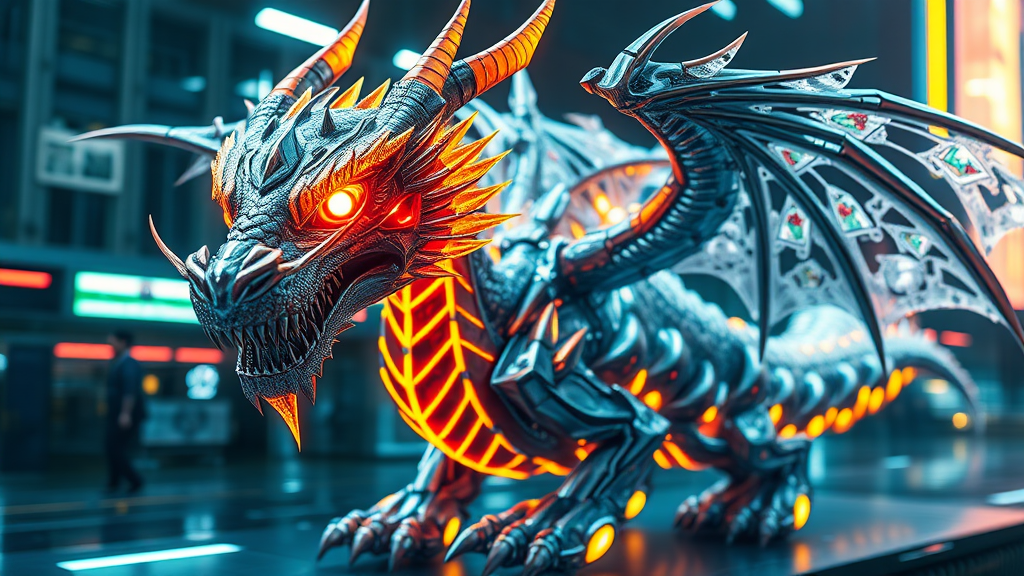 Metal dragon with a futuristic style, featuring fierce eyes and blazing neon lights; a hyper-detailed and realistic 4k depiction with super resolution. Its body is adorned with laser elements, and its wings are styled with an intricate blend of ice and metal effects. Set in a sci-fi environment, this full-body representation showcases the dragon's majestic and awe-inspiring presence in an environment filled with advanced technology. The scene is captured in an aspect ratio of 9:16.