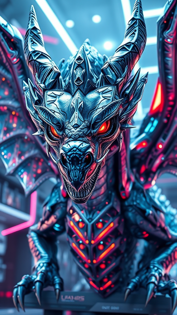 Metallic dragon with fury-filled eyes in a hyper-realistic sci-fi setting, showcasing its full body with ice and metal effect wings, adorned in neon lights that reflect off its scales. The dragon's form is intricately detailed, each scale and feature rendered in super resolution 4k quality. Its menacing gaze is framed by a futuristic environment, where lasers and high-tech elements accentuate the scene. The dragon's presence is imposing, blending seamlessly into the advanced, otherworldly surroundings.