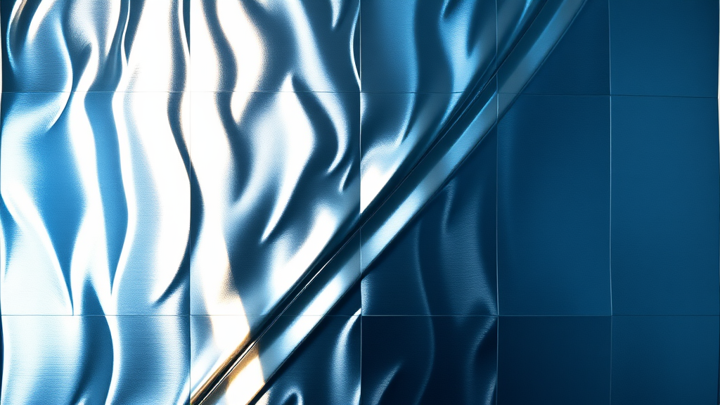 Metallic reflections intertwine in an abstract form, where glowing silvers and dark steel blues create an intricate pattern that stretches vertically. The surface texture is both smooth and ridged, capturing light in a dynamic way that emphasizes depth and complexity. The composition is set in a narrow, towering format, evoking a sense of grandeur and elegance.