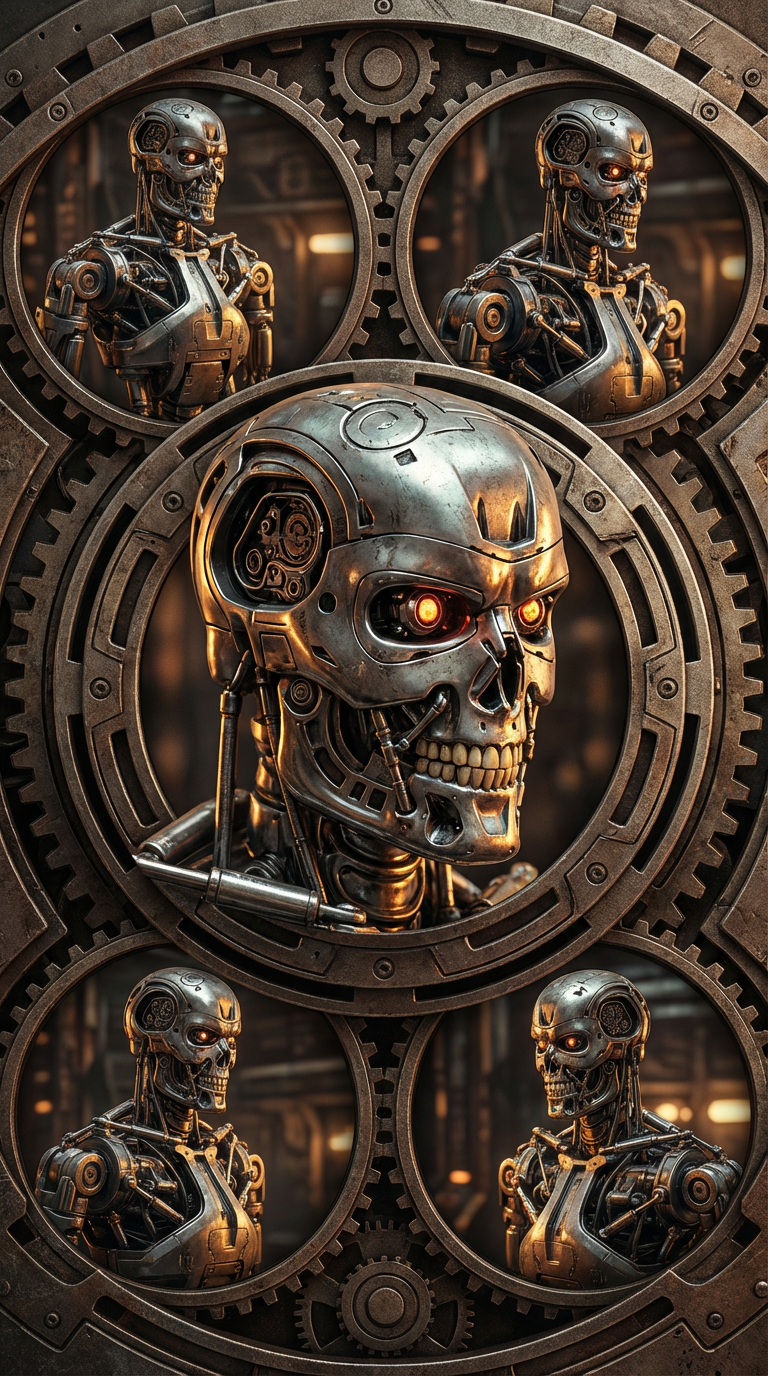 Design a composition featuring the robot (Helix) from the first image as the central, dominant focal point. Surround it with the provided T-800 images in a balanced radial layout. Each vignette should be visually subordinate, with a harmonized palette and style, ensuring they integrate seamlessly without detracting from the central portrait’s clarity or emotional weight. Maintain a strong visual hierarchy and overall compositional coherence.