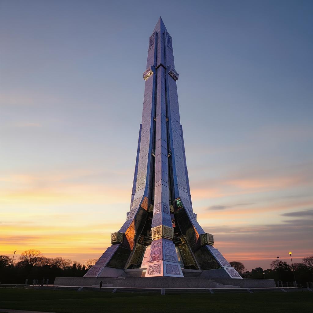 A towering metallic structure glistens under the soft glow of twilight, its intricate patterns and reflective surfaces casting an array of colors. This monument of metal rises majestically against the backdrop of a tranquil evening sky, where warmth meets coolness. Delicate details carved into its surface tell a story of timelessness, as shadows dance along its ridges and curves, creating a symphony of light and shade. The sheer vertical expanse of the structure is both imposing and elegant, capturing the essence of modern artistry infused with an ancient soul. Nearby, a serene landscape adds contrast, enhancing the monument's striking presence with a touch of nature's gentleness.