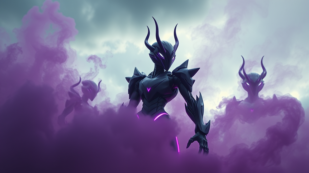 Mewtwo in a mist of swirling purple smoke, towering in giant size with a sleek half-robotic design, tightly rendered in ultra high definition 4k, set against a dramatic backdrop of stormy skies. The scene captures the essence of power and mystery with vibrant hints of neon lights reflecting off metallic surfaces, creating an atmosphere of futuristic enigma.