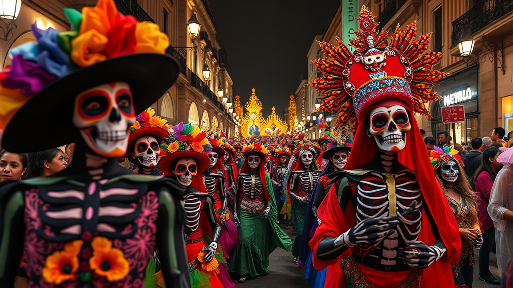 Mexican Day of the Dead celebration in Mexico City with vibrant, high-resolution detail, capturing ultra-realistic scenes of the parade, colorful costumes, intricate face paint, and elaborate altars, set against the lively backdrop of the city's historic streets, atmospheric lighting, --ar 2:1 --stylize 700 --v 6.1.