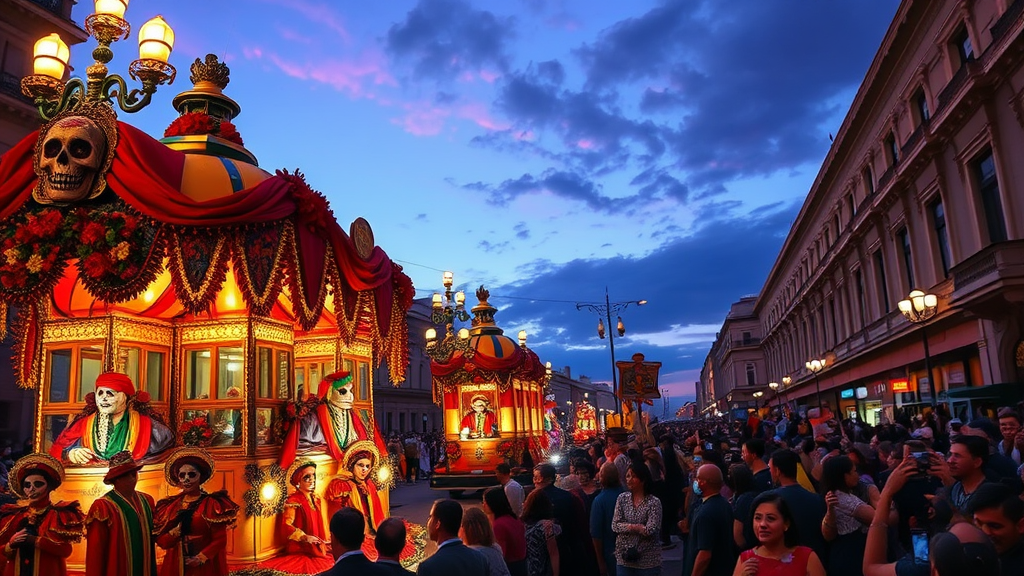 Mexico City Dia de los Muertos procession, vivid high-resolution imagery, hyper-realistic detail capturing the vibrant parade, intricate costumes and traditional face paint, dynamic lighting highlighting the colorful floats under twilight sky, immersive atmosphere with joyous crowds celebrating this unique cultural event --aspect ratio 1:2 --creative enhancement level 750 --version 6.1