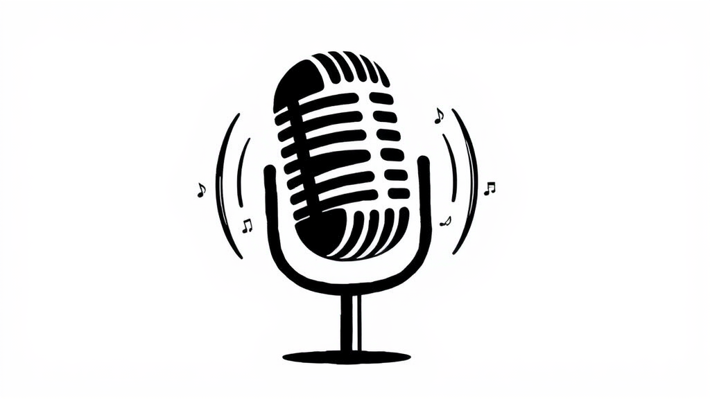 Microphone icon design in black ink style, featuring a sleek and modern 2D silhouette with subtle stylistic embellishments to emphasize sound waves and musical creativity.