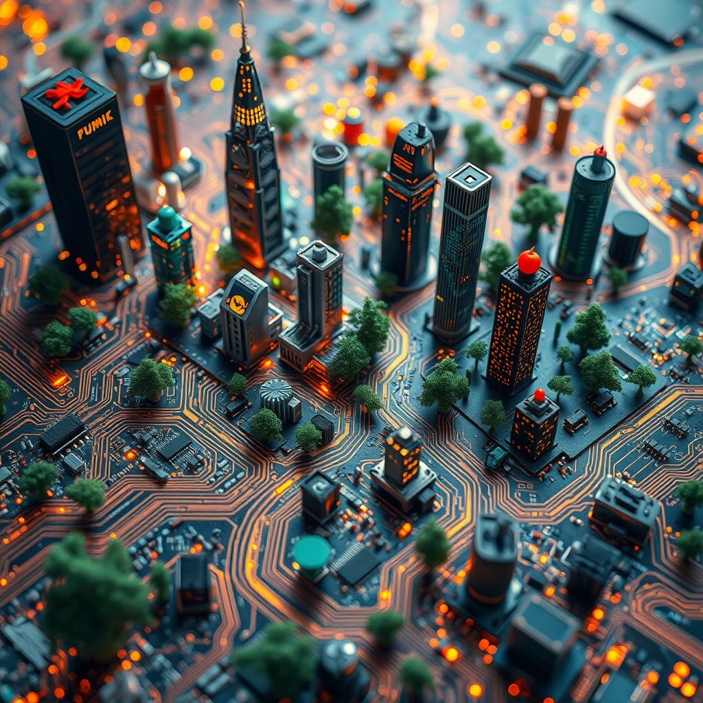 Microscopic metropolis thriving on a hyperrealistic 8k circuit board, bustling inhabitants navigating intricate pathways of silicon valleys and copper rivers, vibrant micro-ecosystems flourishing amidst towering transistor skyscrapers and shimmering LED constellations, a delicate balance of technology and nature intertwined in a miniature world.