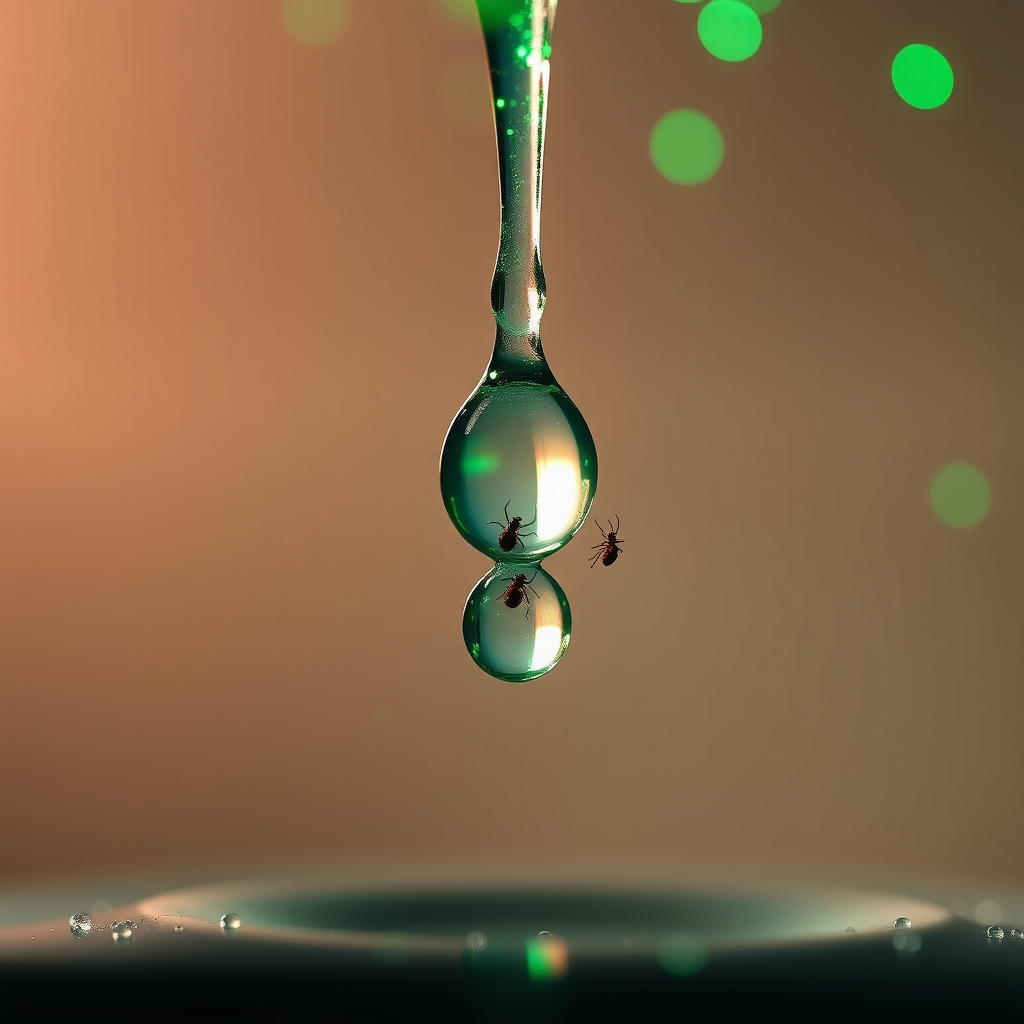 Microscopic photograph of mites suspended in a droplet of water, with luminescent green sparks cascading from above against a gradient backdrop, emitting a vibrant emerald glow. The scene features a shallow depth of field with volumetric lighting, cinematic ambiance, and intricate detail, presenting an ultra-realistic portrayal. The image captures a harmonious chaos, focusing on the delicate balance between light and shadow, with the ratio subtly altered to 16:9 for broader visual impact.