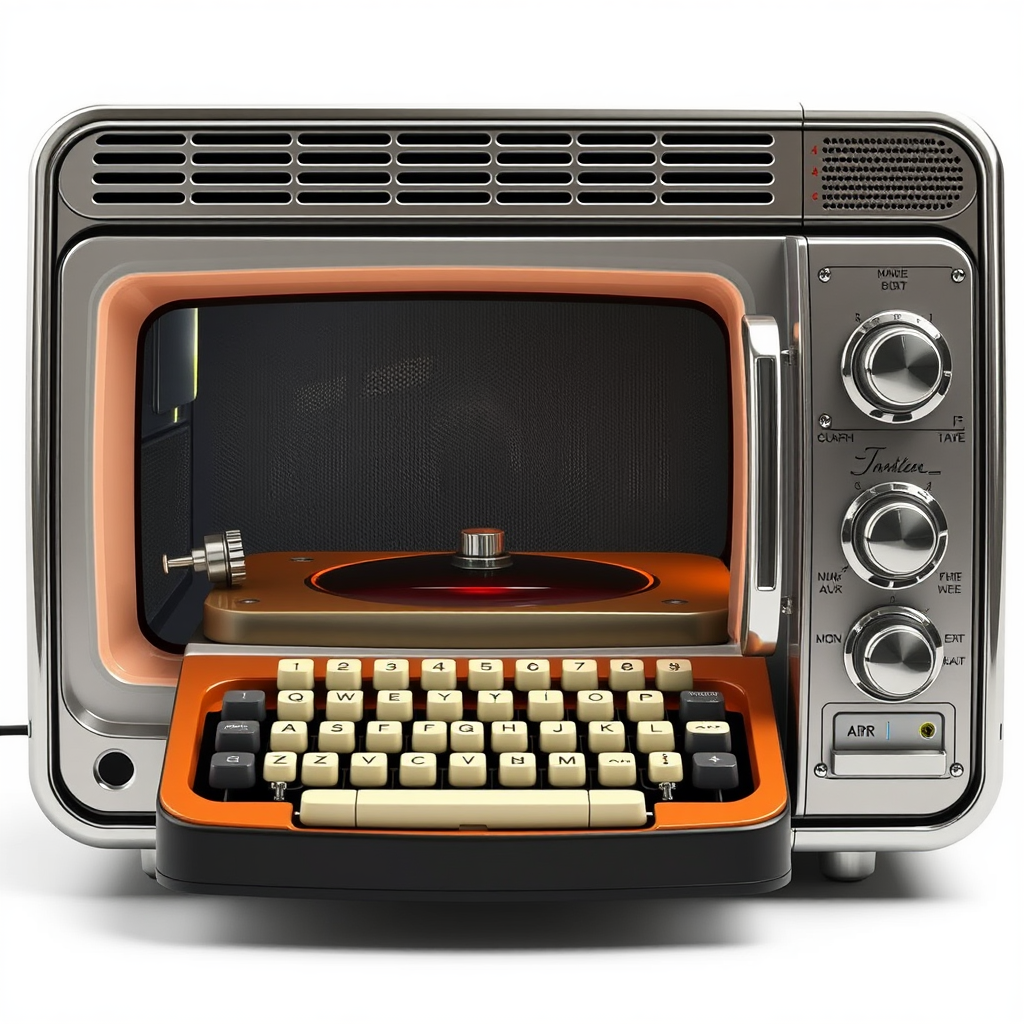 Microwave, featuring typewriter-inspired retro-futuristic design, capturing the essence of 1950s and 60s aesthetics, intricately detailed, styled like artstation digital art, hyper-realistic with emphasis on depth of field, set against a white background, rendered in unreal engine, 8K resolution, 1:1 aspect ratio.