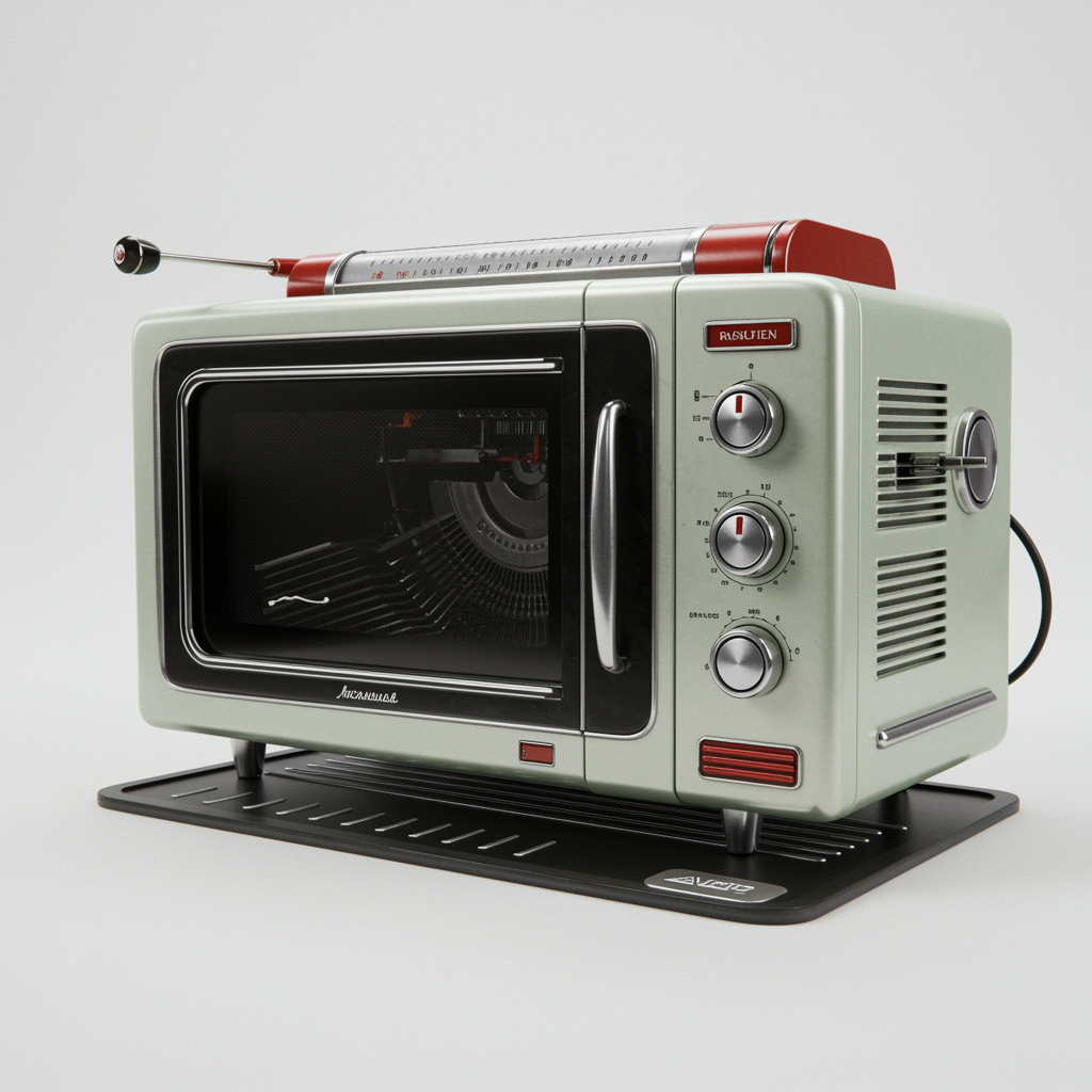 View this AI-generated image featuring microwave styled like a typewriter with retro futuristic design elements drawing inspiration from the 1950s and 60s aesthetics intricately detailed artstation style digital artwork hyper detailed and hyper realistic set against a pristine white background rende