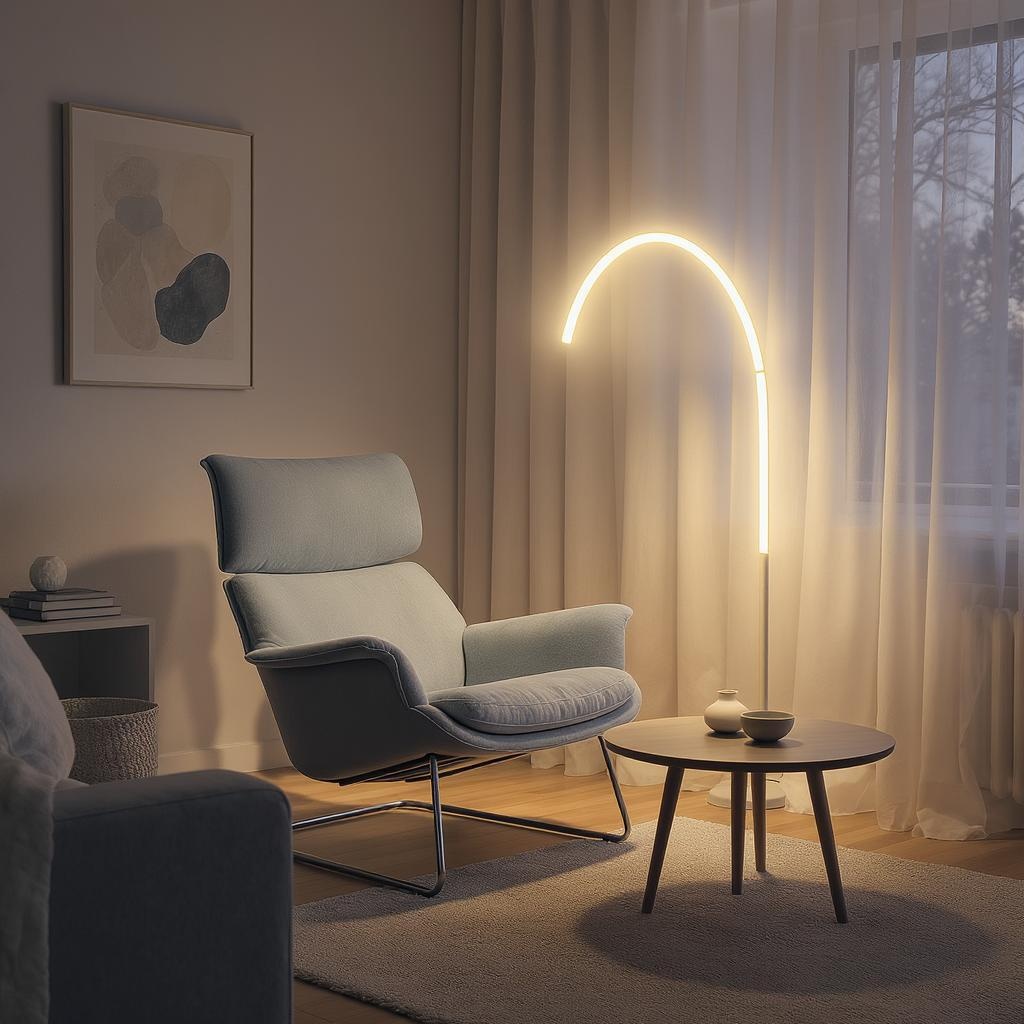 Mid-sized living room with a cozy ambiance, Dieter Rams 620 chair program in a soft gray tone, Flos Arco floor lamp casting a gentle arc of light, captured with a Nikon Z6 II and a 50mm f/1.4 lens to enhance depth, twilight light filtering through delicate sheer white curtains, adding a warm, tranquil glow to the room.