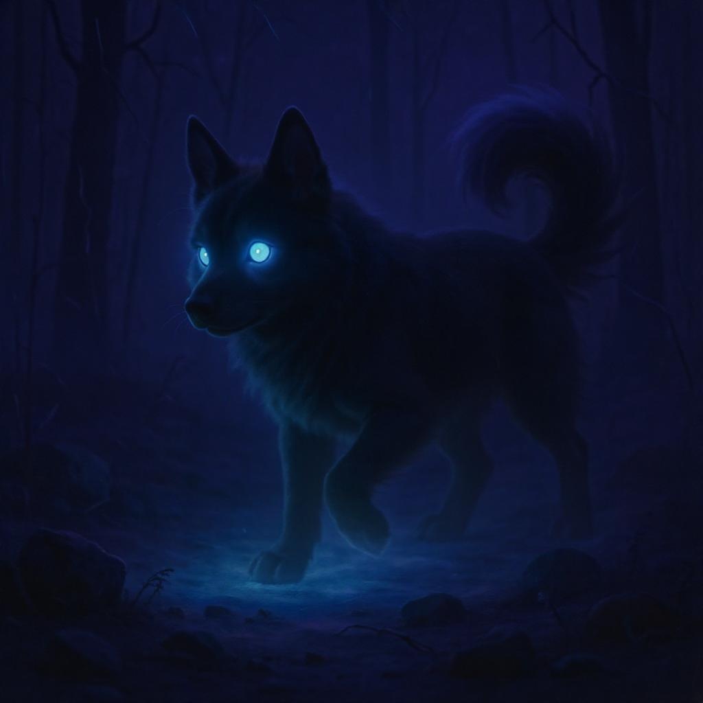 Midnight canine, glowing fur illuminated under ultraviolet hues, exploring the shadows with vibrant eyes and ethereal luminance.