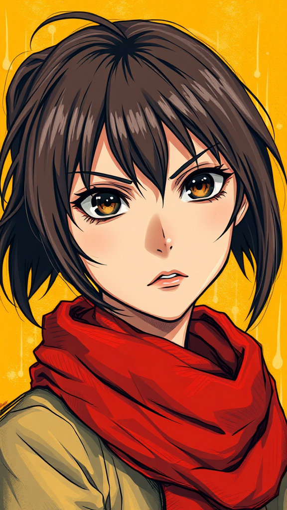 Mikasa Ackerman depicted in a style reminiscent of Vincent van Gogh, capturing her with an intense and determined expression. Her features are rendered in vivid detail, blending the dynamism of anime with Van Gogh's iconic swirling brushstrokes. She wears her signature red scarf, which stands out strikingly against a vibrant yellow background, adding warmth and contrast to the composition. The portrait’s focus on texture and movement encapsulates both the elegance and aggression of the character, while subtle variations in color and line enhance the overall depth and drama of the piece.