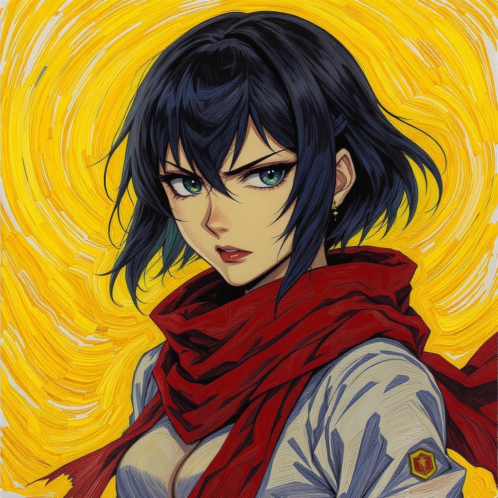 Mikasa Ackerman depicted in the vibrant, swirling brush strokes reminiscent of Vincent van Gogh, a portrait capturing her fierce determination, with intricate attention to detail, blending anime aesthetics, adorned in her iconic red scarf, set against a dynamic yellow backdrop, slight alterations to enhance her intensity while maintaining the essence of the original inspiration.