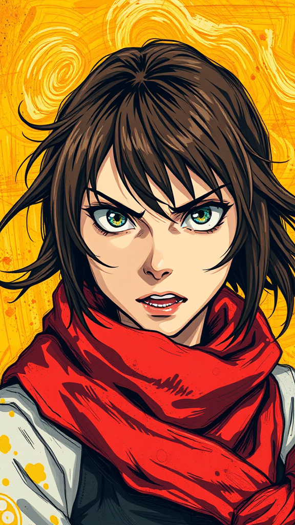 Mikasa Ackerman portrayed with the swirling brushwork of Vincent van Gogh, capturing an intense, aggressive expression, intricately detailed in an anime style. She wears a vibrant red scarf that stands out against a richly textured golden-yellow background, embodying a dynamic fusion of movements and colors. Her eyes, fierce and determined, reflect a whirlwind of emotions, echoing the turbulent energy of Van Gogh's masterpieces.