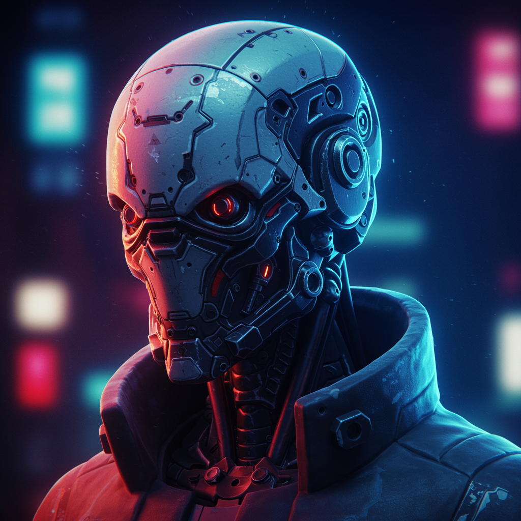Military cyberpunk Nours robot, equipped with stealth capabilities, bathed in neon lights; features a meticulously designed character with hard surface elements, blending smooth textures and a highly detailed, symmetrical face. The aesthetic melds real-time VFX with volumetric and ambient lighting, capturing a digital 3D UHD HDR cartoon style. Inspired by anime and digital painting, it also draws on abstract metal sculpture. The character embodies a fusion of cyborg and human, with intentional asymmetries and elements like holes and mouth partially out of frame. Despite a deliberate inclusion of bad art features, such as blurry aspects and unusual proportions, it stands as a unique work free from signatures, words, or watermarks.