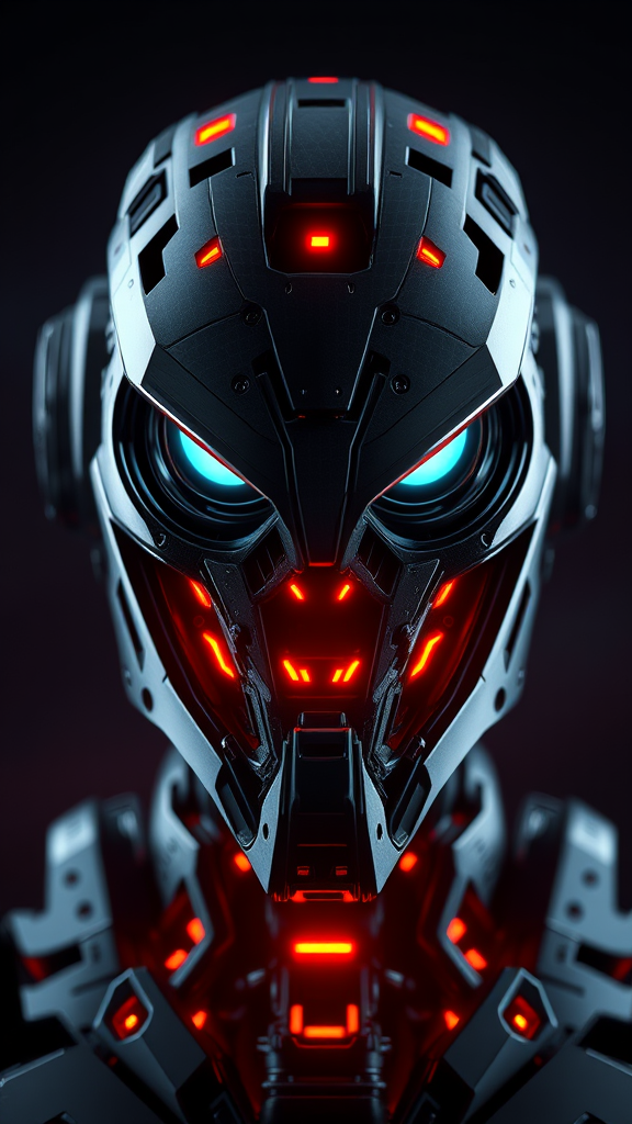 Military cyberpunk nousr robot, featuring stealth elements with glowing accents in its character design. The robot has a hard surface with smooth, detailed features, focusing on a highly intricate and symmetrical face, while maintaining a real-time, VFX presence with volumetric and ambient lighting effects. Crafted as a digital 3D model, the design is showcased in UHD and HDR, capturing a blend of cartoon and anime styles through digital painting and illustration techniques. The structure resembles an abstract metal sculpture with cyborg and human elements, incorporating asymmetrical shapes and strategically placed holes. Despite its advanced design, the face and mouth appear slightly out of frame, adding an element of intrigue. The overall composition skillfully balances both symmetry and asymmetry, while avoiding bad art elements such as blurry or gross proportions. The design is purposefully devoid of any signature, words, descriptions, or watermark, focusing purely on the visual impact of its cyberpunk essence.