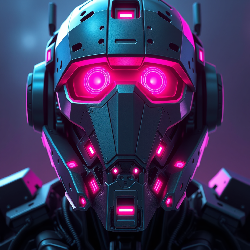 military cyberpunk nousr robot, stealth, vibrant neon lights, character design, hard surface, smooth, intricately detailed face, symmetrical with real-time rendering, vfx, volumetric and ambient lighting, digital 3d, uhd hdr cartoon style, anime influences, digital painting, abstract metal sculpture, cyborg-human hybrid, asymmetrical elements, with openings and intriguing features, with details emerging out of frame, distorted proportions and abstract composition, inclusion of abstract signatures and markings.