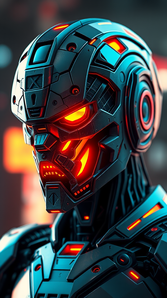 Military cyberpunk nousr robot, stealthy with neon-laced features, character design showcases hard surface textures contrasted with smooth, detailed faces. Emphasizes intricate, symmetrical details, rendered in real-time with dynamic VFX, enhanced by volumetric and ambient lighting. A digital 3D creation in UHD and HDR, blending cartoon and anime styles through digital painting and illustration. Combines elements of abstract metal sculpture and cyborg-human synthesis, featuring asymmetrical design with strategic holes and mouth elements. Composition plays with out-of-frame elements, intentionally embracing flawed art aspects like blurring and unconventional proportions. Signature and watermark elements are subtly integrated into the design.