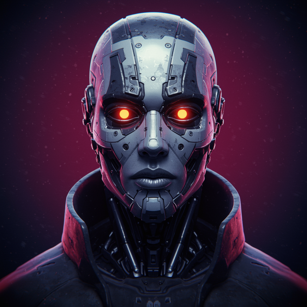 military cyberpunk robot, stealth approach, vibrant neon lights, character design focus, hard surface construction, sleek and smooth textures, highly detailed and intricate facial features, symmetrical and visually captivating, real-time rendered vfx, volumetric and ambient lighting effects, digital 3d aesthetics, uhd hdr quality, cartoon and anime influences in digital painting style, abstract metal sculpture theme, merging cyborg and human elements, subtle asymmetry, unique cutouts and openings, dynamic mouth expression, extending beyond traditional frames, deliberate artistic imperfections, slight blurriness for depth, creative proportions, distinct signature style without explicit text or watermarks.