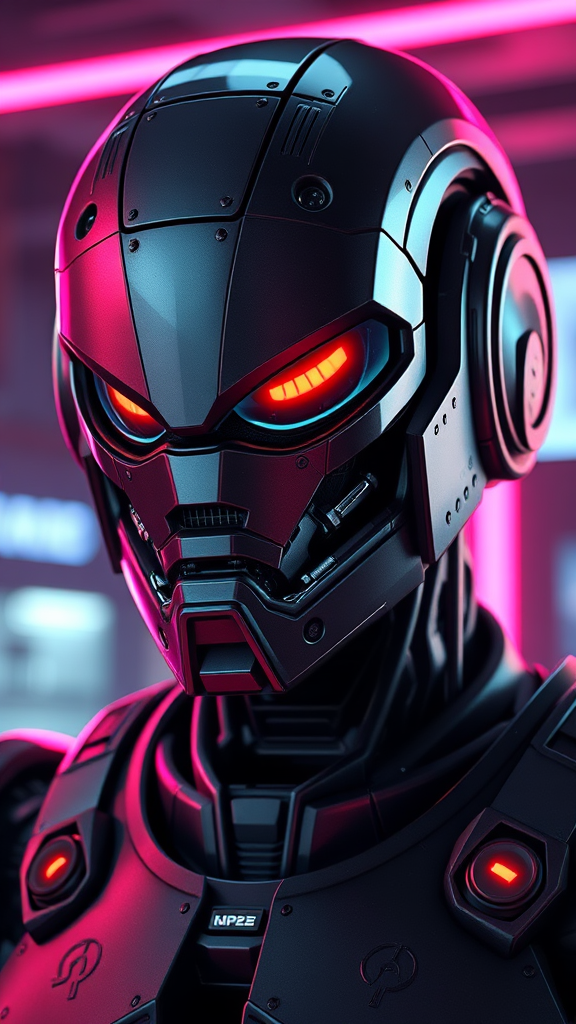 Military cyberpunk robot with stealth capabilities, set against a backdrop of neon lights. The character design features a hard surface with smooth, symmetrical lines. Its face is intricately detailed, with real-time VFX elements, enhanced by volumetric and ambient lighting. The digital 3D design is rendered in UHD HDR, blending the styles of cartoon, anime, and digital painting. The abstract metal sculpture adds a cyborg touch, integrating human elements with asymmetrical features like holes and a partially out-of-frame mouth. The artwork avoids bad art elements like blurry or grossly distorted proportions while maintaining a clean aesthetic free of signatures or watermarks.