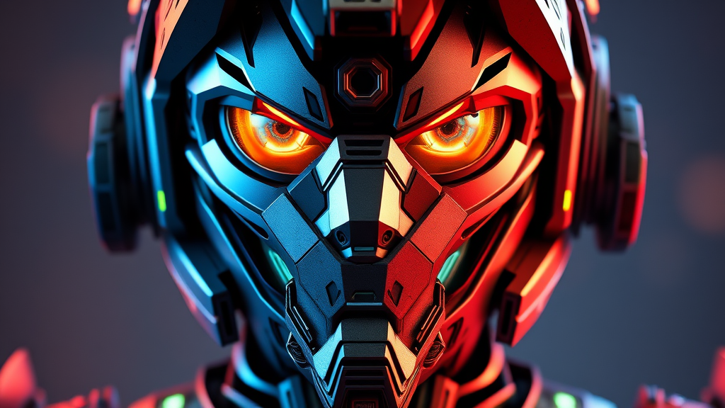 Military-inspired robotic warframe character design with a focus on a highly detailed and symmetrical face, emphasizing intricate hard surface details. The piece is rendered in digital 3D, showcasing real-time effects with VFX elements, accentuated by volumetric and ambient lighting. The ultra HD and HDR settings enhance the visual depth, keeping the character sharp and in focus while subtly fading the background. The design maintains a clean and professional finish, avoiding any blurry or distorted proportions, with no signatures, words, or watermarks present.