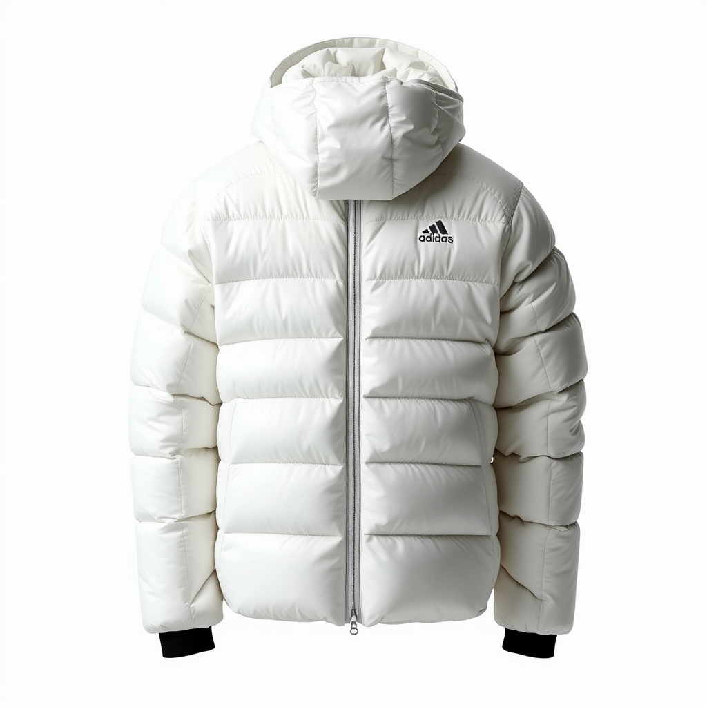 Milky white Adidas winter puffer jacket featuring a design inspired by Kanye West, showcasing a blend of futuristic and minimalist aesthetics. The jacket exhibits an intricate and detailed texture, with octane-inspired highlights adding a touch of modernity. Set against a clean white background, this 4K design emphasizes sleek lines and innovative patterns, creating a seamless fusion between avant-garde fashion and functional winterwear. The style embodies a bold yet sophisticated look suitable for contemporary urban trends.