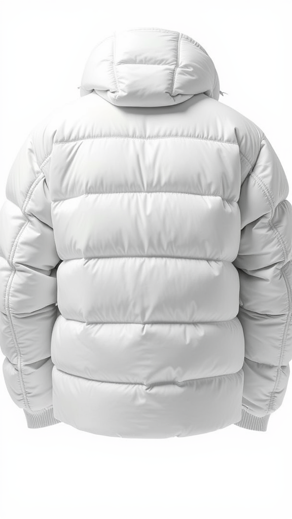 Milky white puffer jacket in the signature design style of Kanye West for Adidas, showcasing a winter theme with a modern twist. The jacket features a high-definition, intricate texture, and detailed stitching. Shot on a clean white background in 4K resolution, it presents a luxurious and sophisticated appearance, maintaining the core design elements while introducing subtle creative elements for enhanced appeal.