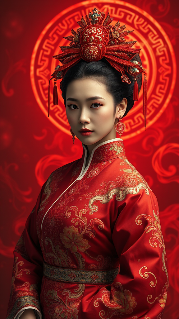 Ming dynasty Chinese costume infused with fiery motifs, styled in surrealistic portraiture emphasizing feminine elegance; a digital art marvel blending symbolism and Indonesian artistic elements. This illusionary depiction, rich in hyper-detailed red tones and hyper-realistic textures, unfolds in a 4D dimension. Emphasizing ultra-realistic, cinematic quality with the highest detail, the piece captures a unique fusion of cultures in a dreamlike, captivating landscape.