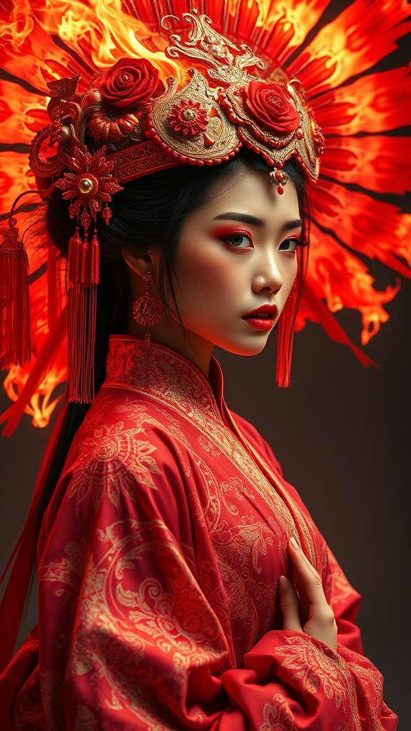 Ming dynasty-inspired fire costume with surrealistic portraiture elements, showcasing feminine affluence, digital artistry marvels, and rich symbolism intertwined with Indonesian artistic influences. Featuring illusionary painting techniques and hyper-detailed, hyper-realistic red nuances, the image elevates into a 4D dimension capturing the essence of ultra-realism with the finest detail quality. This cinematic depiction in 28:27 aspect ratio pushes the boundaries of visual storytelling with a quality density setting at 2 and a stylization index of 750 in version 5.1.