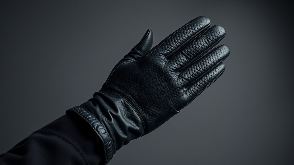Minimalist focus on finely crafted gloves with a textured matte black finish in a rich charcoal hue, highlighted by a subtle yellow accent point. Captured with a macro lens at f/5.6 to emphasize the intricate leather pattern, the lighting is skillfully adjusted to create dramatic shadow play, set against a muted grey studio backdrop.
