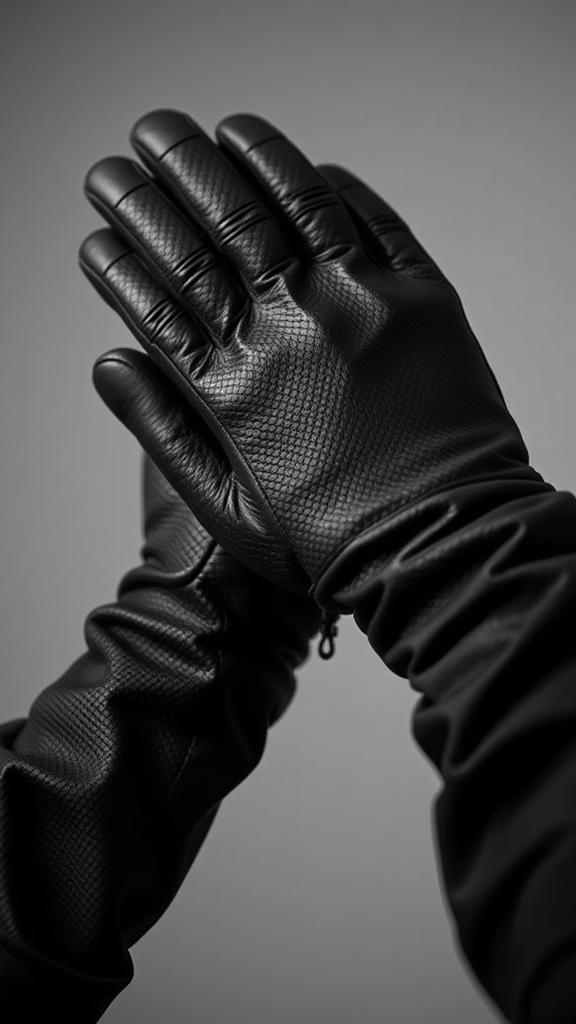 Minimalist focus on gloves with a textured matte black surface, featuring a subtle dark grey hue accented with a yellow point, captured with a macro lens at f/5.6 to emphasize the intricate leather pattern and craftsmanship. The lighting is strategically adjusted to cast defining shadows, set against a soft grey background with precise studio lighting to highlight the details.