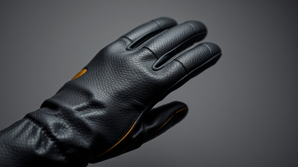 Minimalist gloves featuring a textured matte black leather surface with a subdued charcoal hue and a striking yellow accent point, captured using a macro lens at f/5.6 to emphasize the intricate leather pattern and craftsmanship. The lighting is meticulously adjusted to cast a defining shadow, set against a muted grey background under controlled studio lighting.