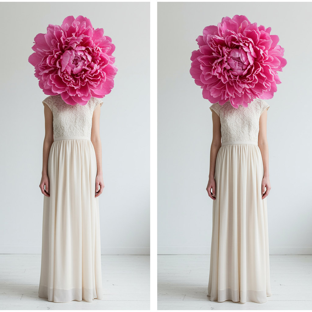 Minimalist white room featuring two girls in elegant dresses, their heads entirely obscured by lush pink peonies, captured in two highly detailed photographs with a tall aspect ratio.