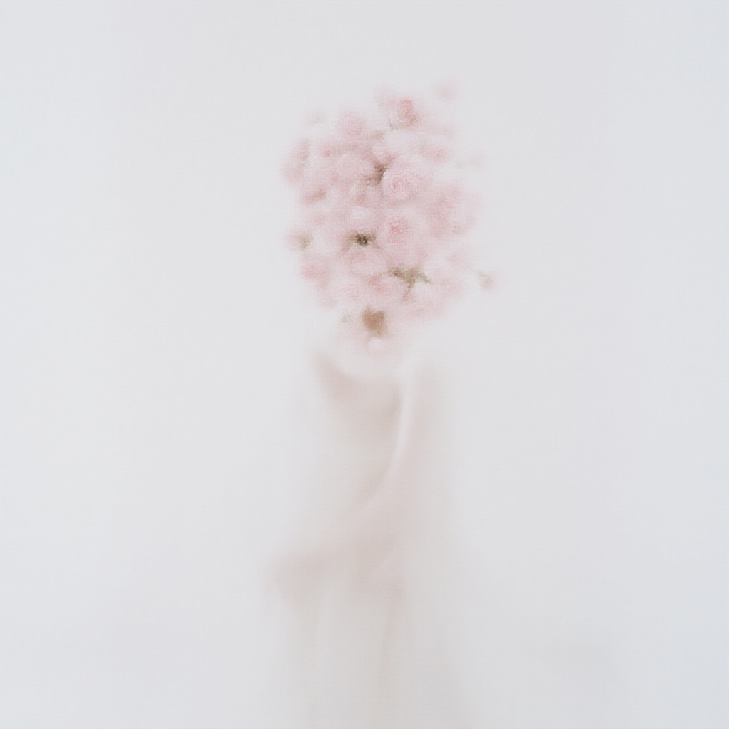 Minimalist white room with bare walls, featuring a girl in an elegant dress, her face obscured by a cascade of pink peonies, captured in two high-resolution photos, showcasing intricate details and a serene atmosphere.