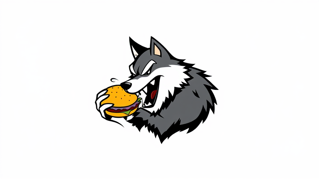 Minimalistic vector logo design depicting a Wolfman enjoying a burger, with clean lines and a black silhouette on a white background, incorporating subtle whimsical elements to emphasize the character's playful nature.