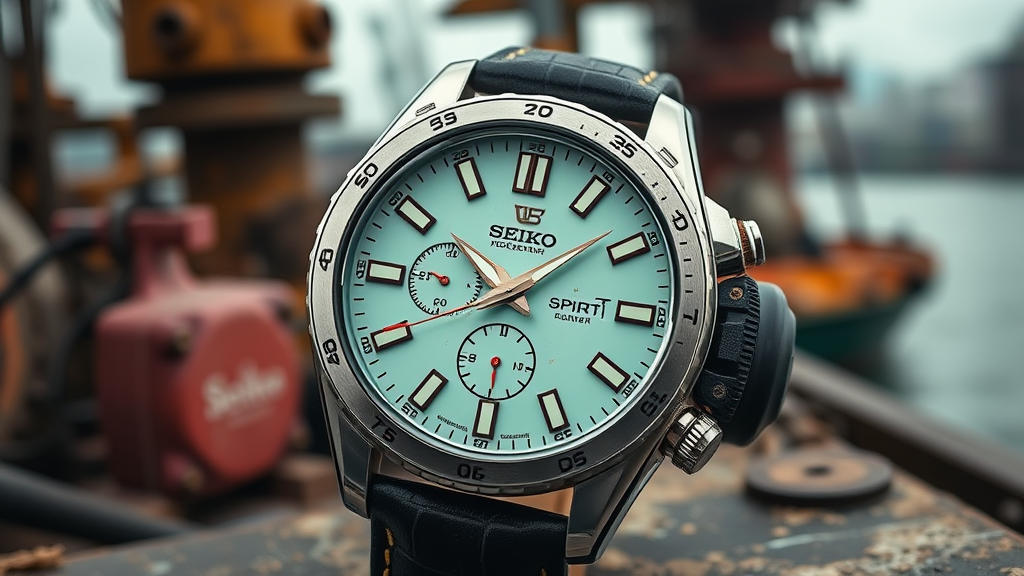 minty jade seiko spirit h35 with ebony numerals and chronograph trim in the anatomy of a traditional japanese sport watch, tokina at-x 11-16mm f/2.8 ii af with eccentric lens design elements, ocean academia aesthetic in a gritty industrial harborside setting, photorealistic metallic details with subtle wear and patina, holotone printing mimicking the texture of well-worn steel, stark and unfiltered cinematography with a 6.0 aspect ratio and 4:7 aspect ratio, polished stainless steel bezel with visible thread inserts, rugged black leather strap with contrasting off-white stitching, and a roman numeral date wheel in a distressed finish.