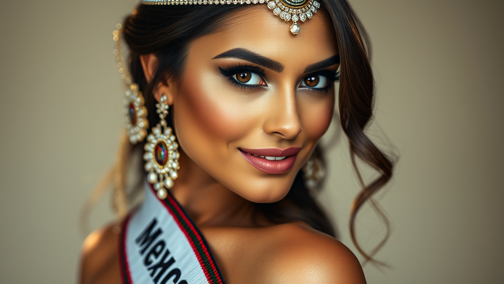 Miss Mexico depiction of a stunning Mexican woman, extraordinary detail, 32-megapixel, ultra-high-definition, 85-mm-lens, crisp-focus, f:8, ISO 200, shutter-speed 1:100, soft-back-lighting, prize-winning photo, subtle-catchlight, enhanced-sharpness, harmonious-facial-features, 8k resolution, cinematic composition, portrait perfection, radiant elegance.