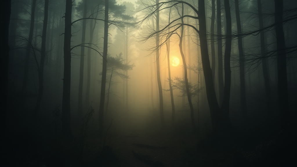 misty forest, ethereal twilight, enchanting glow, soft ambient light, layered textures, distant whispers, serene atmosphere, hidden pathways, gentle rustling, mystical aura, deep tranquility, alluring shadows