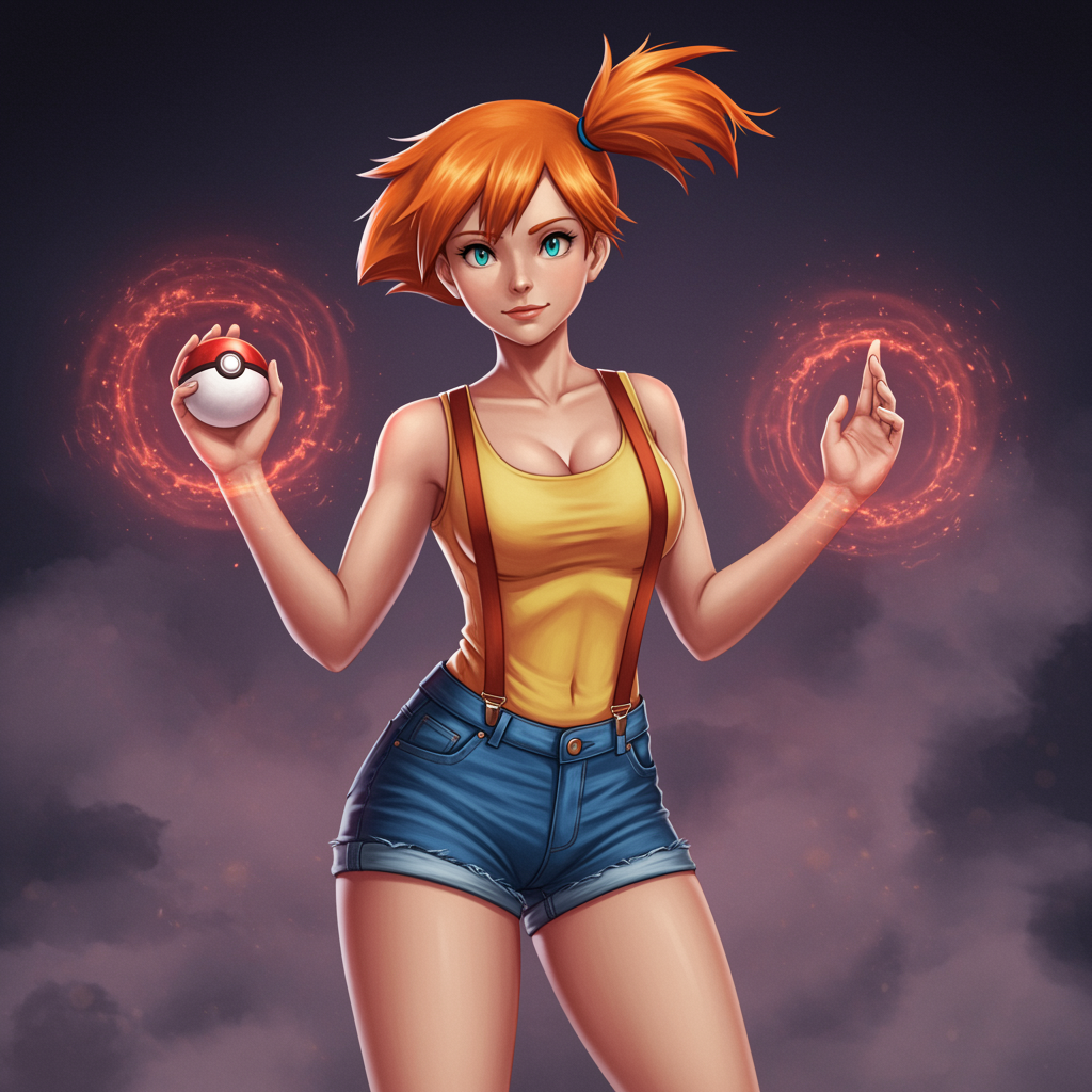 Misty from Pokémon standing confidently, holding a Pokéball surrounded by a mystical fog, with vibrant orange hair flowing. Her attire includes a snug tank top with suspenders resting over it, paired with low-waisted jean shorts. The look is eye-catching, drawing attention to her athletic and curvy figure.