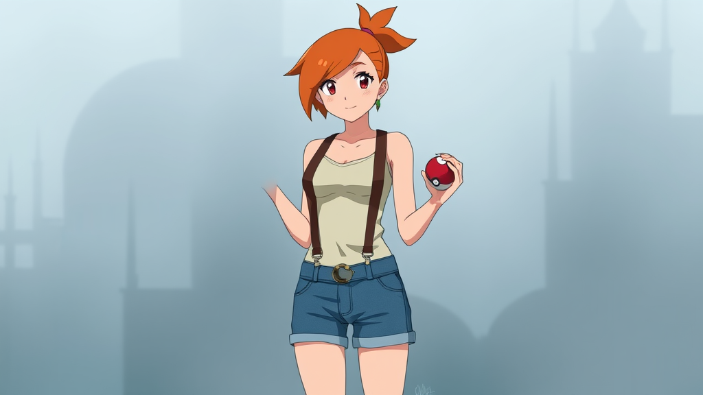 Misty from Pokémon standing in a mysterious foggy setting, holding a pokeball confidently. She has bright orange hair tied up in her signature style. Her outfit consists of a stylish tank top accentuated by suspenders, showcasing her adventurous and energetic spirit. She pairs this with low-waisted jean shorts that complement her look.
